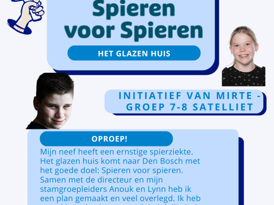 Mirte uit groep 7-8 (de Satelliet) heeft het initiatief genomen om een actie op te zetten op onze school: KC de Ontdekking in Den Bosch. Haar neef heeft zelf een spierziekte en ze heeft hier ook een presentatie over gegeven op school, aan haar klas en aan de directeur. Met de kerstgedachte in ons hoofd, willen we graag zoveel mogelijk geld inzamelen voor het goede doel: Spieren voor spieren. Help jij ons mee? Op school zamelen we ook allemaal geld in. Op de vrijdag voor de kerstvakantie maken we het bedrag bekend aan de hele school.