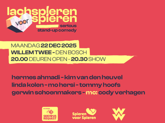 Als onderdeel van de actie van Serious Request organiseer ik een stand-up comedy show met de naam Lachspieren voor Spieren. Met zes hele fijne comedians die je lachspieren flink zullen testen. Hermes Ahmadi, Mo Hersi, Linda Kolen, Tommy Hoofs, Kim van den Heuvel en Gerwin Schoenmakers gaan jullie vermaken en Cody gaat als MC de avond aan elkaar praten en Akula Samsam zal voor de fijne plaatjes zorgen. Kortom het wordt een topavond!