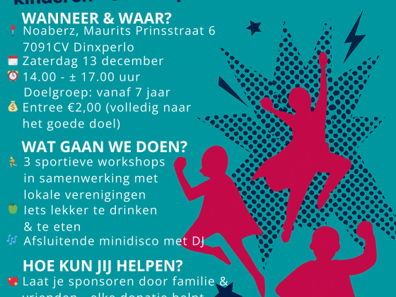 Op zaterdag 13 december vind er een sportlieve middag voor kinderen plaats. Tijdens deze middag gaan de deelnemers deelnemen aan drie verschillende workshops, begleidt door lokale verenigingen. Als afsluiting vindt er een minidisco met DJ plaats. We hopen zoveel mogelijk geld op te halen voor het goeie doel!