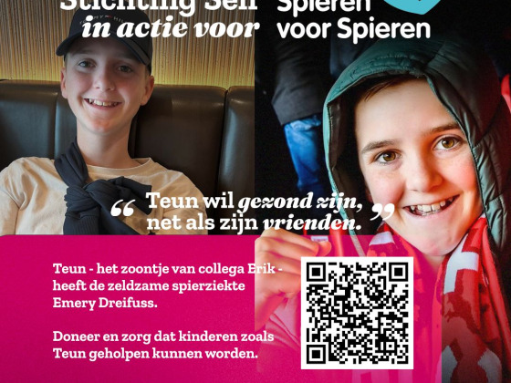 Dit doen we onder andere voor Teun; het zoontje van onze collega Erik. Hij heeft een zeer zeldzame spierziekte. In Nederland kent hij maar één lotgenootje. Omdat deze spierziekte zo weinig voorkomt, wordt er amper onderzoek naar gedaan en is er op dit moment weinig perspectief. Het verhaal van Teun lees je hier: “Teun wil gezond zijn, net als zijn vrienden."