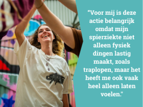 “Voor mij is deze actie belangrijk omdat mijn spierziekte niet alleen fysiek dingen lastig maakt, zoals traplopen… maar het heeft me ook vaak heel alleen laten voelen. Het gevoel dat je niet altijd mee kunt doen, hakt er best in. Daarom ben ik zó dankbaar dat er stichtingen zijn zoals Spieren voor Spieren en Join Us. Zij zorgen ervoor dat je je gezien voelt, dat je niet aan de zijlijn staat en dat betekent echt heel veel voor mij.”