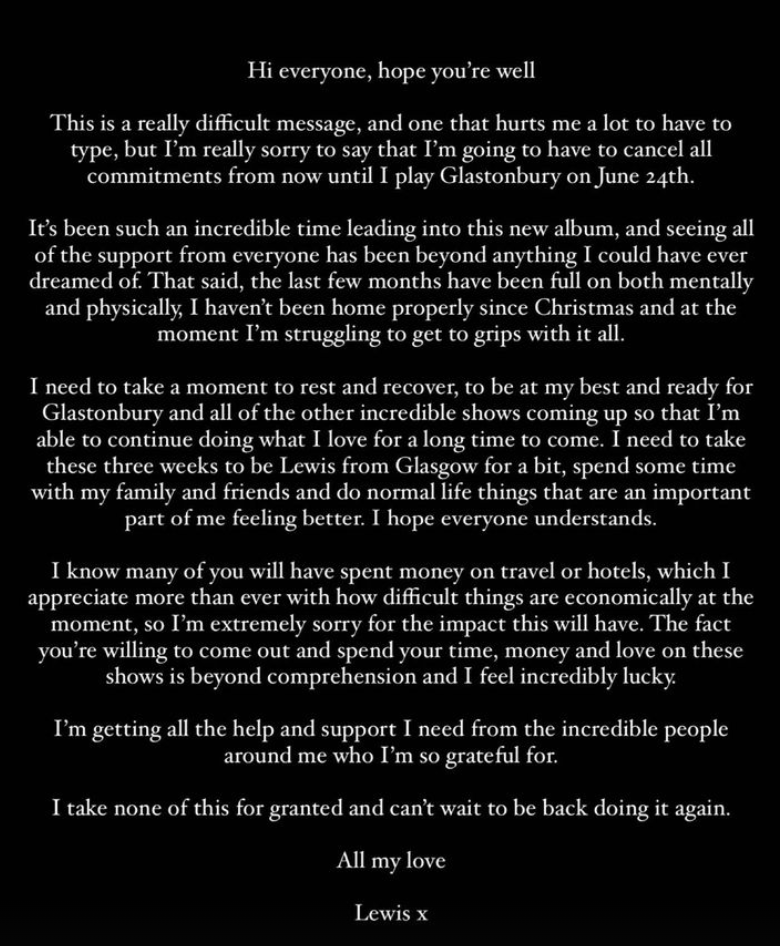 Lewis moet rusten, want het is hem even fysiek en mentaal teveel. In een statement op Instagram zegt hij: "Dit is een moeilijk bericht en eentje die mij pijn doet om te schrijven. Maar het spijt mij heel erg om te zeggen dat ik mijn verplichtingen moet afzeggen, van nu totdat ik op 24 juni op Glastonbury speel. Ik ben niet echt thuis geweest sinds Kerst en op het moment worstel ik ermee om een beetje vat te krijgen op alles."