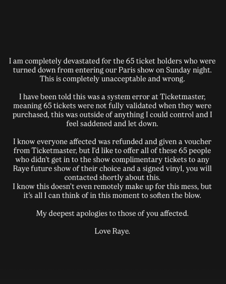 RAYE schrijft op Instagram: 'Er is mij verteld dat het een systeemfout was bij Ticketmaster. Dit betekent dat 65 tickets niet compleet geldig waren toen ze waren gekocht. Het was buiten mijn controle en ik voel me erg verdrietig en in de steek gelaten.'