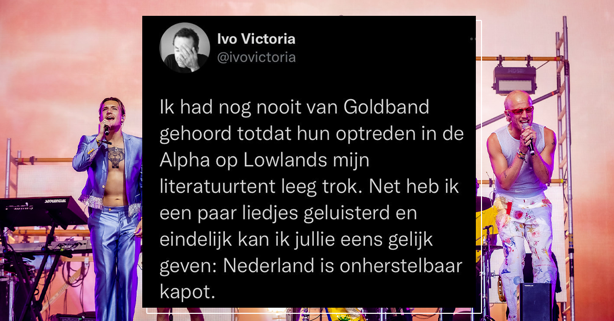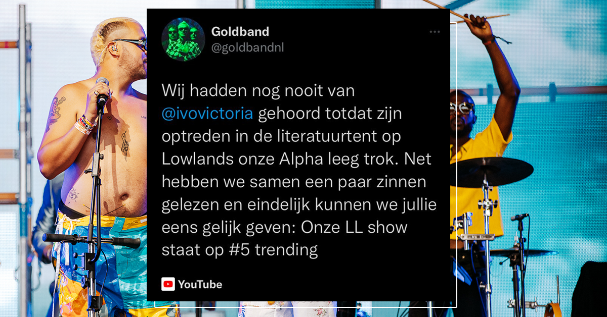 Goldband had een top weekend. Vrijdag Pukkelpop in België platspelen en zondag lieten ze iedereen vroeg pieken op Lowlands. Schrijver Ivo Victoria kon het niet laten om van zich te laten horen toen zijn literatuurtent leeg trok op Lowlands, waar Goldband dan weer op hun beurt op reageerde.