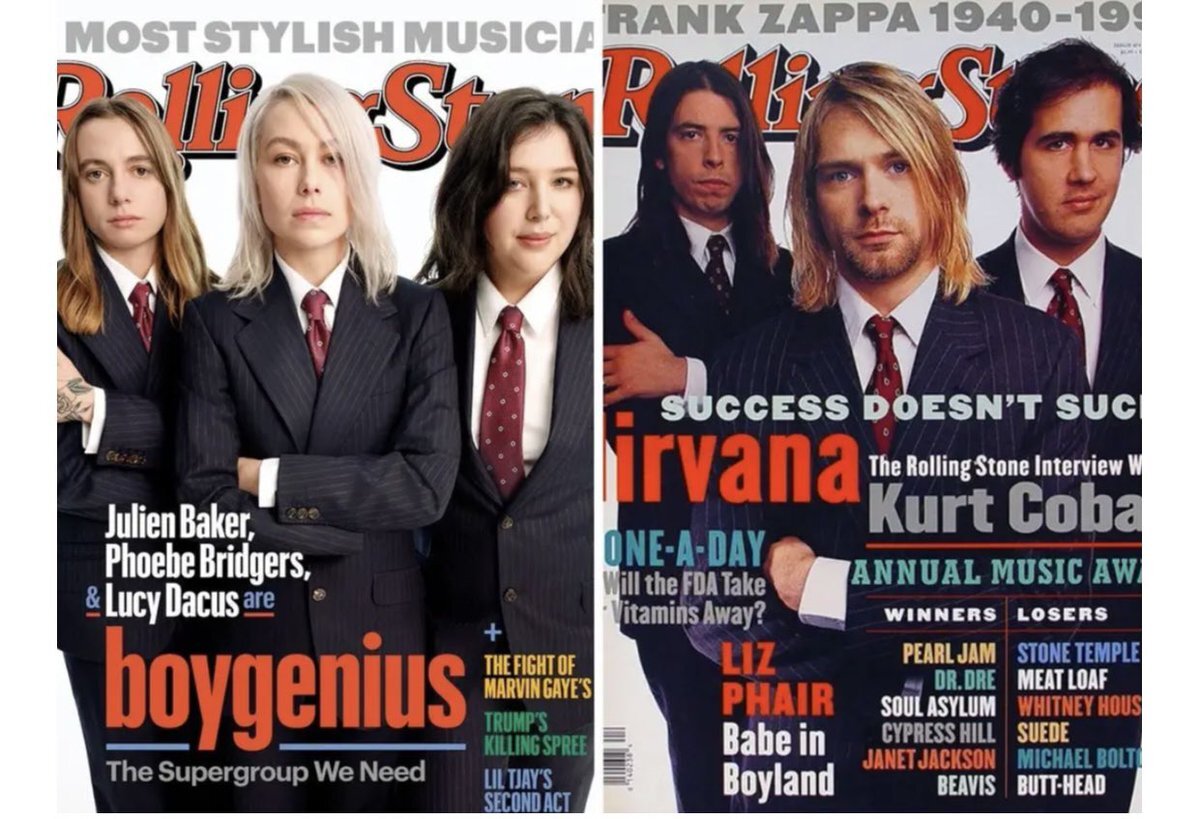 Links de cover met boygenius in 2023, rechts Nirvana in 1994