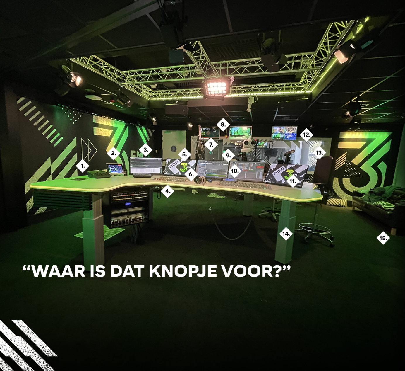 13. Ruimte waar het team achter een programma zit. Om bandjes te mixen, maar ook om beeld te schakelen.