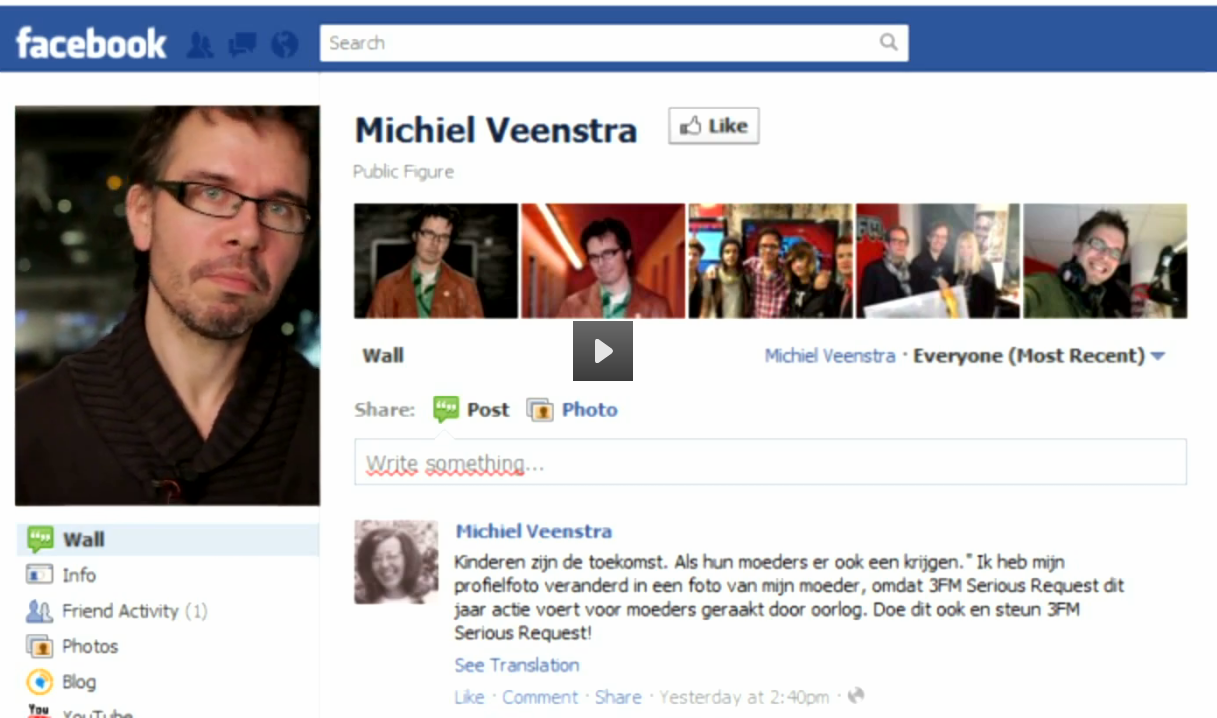 Volgers van 3FM op Facebook, Twitter en Hyves zijn vaak benieuwd of ze op hun profielpagina een bijdrage kunnen leveren aan 3FM Serious Request. Michiel Veenstra heeft samen met Eigenwijzer.nl een manier bedacht waarop dat mogelijk is.