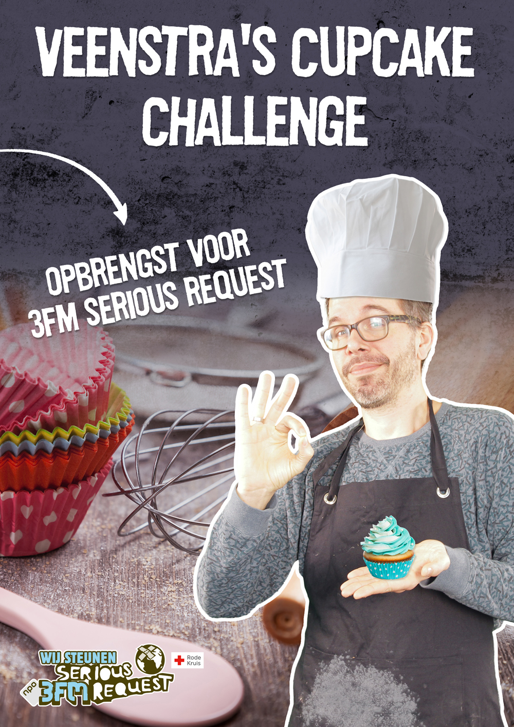 Ik moet in 24 uur zoveel mogelijk geld ophalen met zelfgemaakte cupcakes. Die bak ik ter plekke IN het huis, maar ik hoop dat ook zoveel mogelijk mensen thuis gaan bakken en verkopen. Dat kan je doen door even naar 3fm.nl/kominactie te surfen.