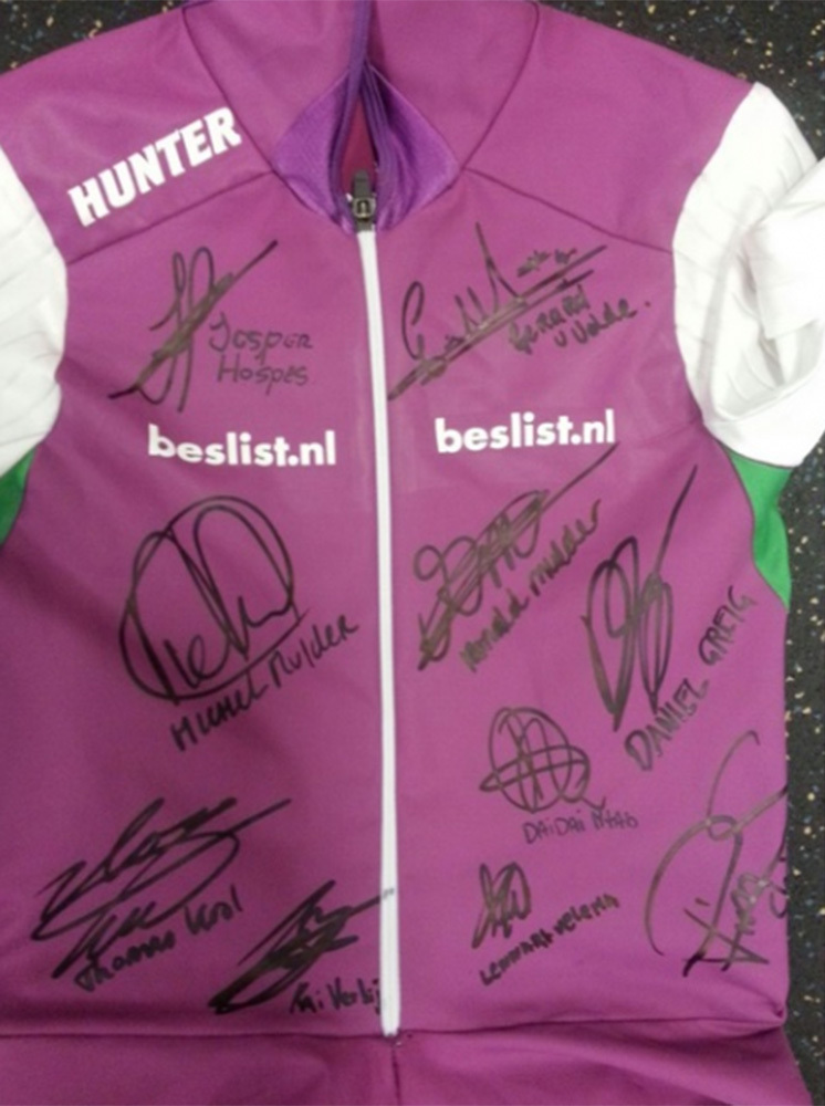 COOL! Topschaatsers Michel en Ronald Mulder bieden namens hun hele schaatsteam een gesigneerd schaatspak aan! De tweelingbroertjes hebben hun hele schaatsploeg opgetrommeld om hun handtekening op het pak te zetten.