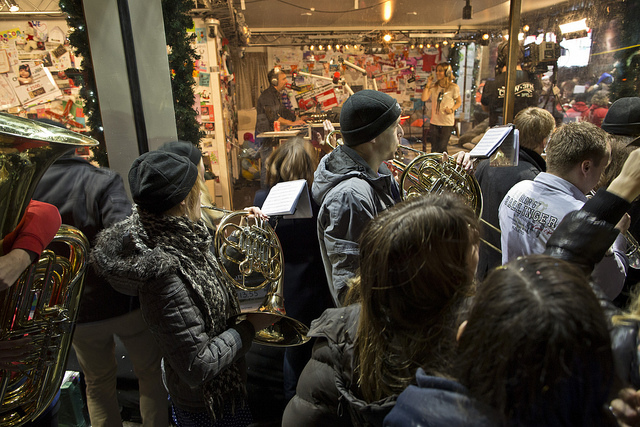 De fanfare komt aan met een hele dikke cheque. De muzikanten blazen behoorlijk in de collectebus.