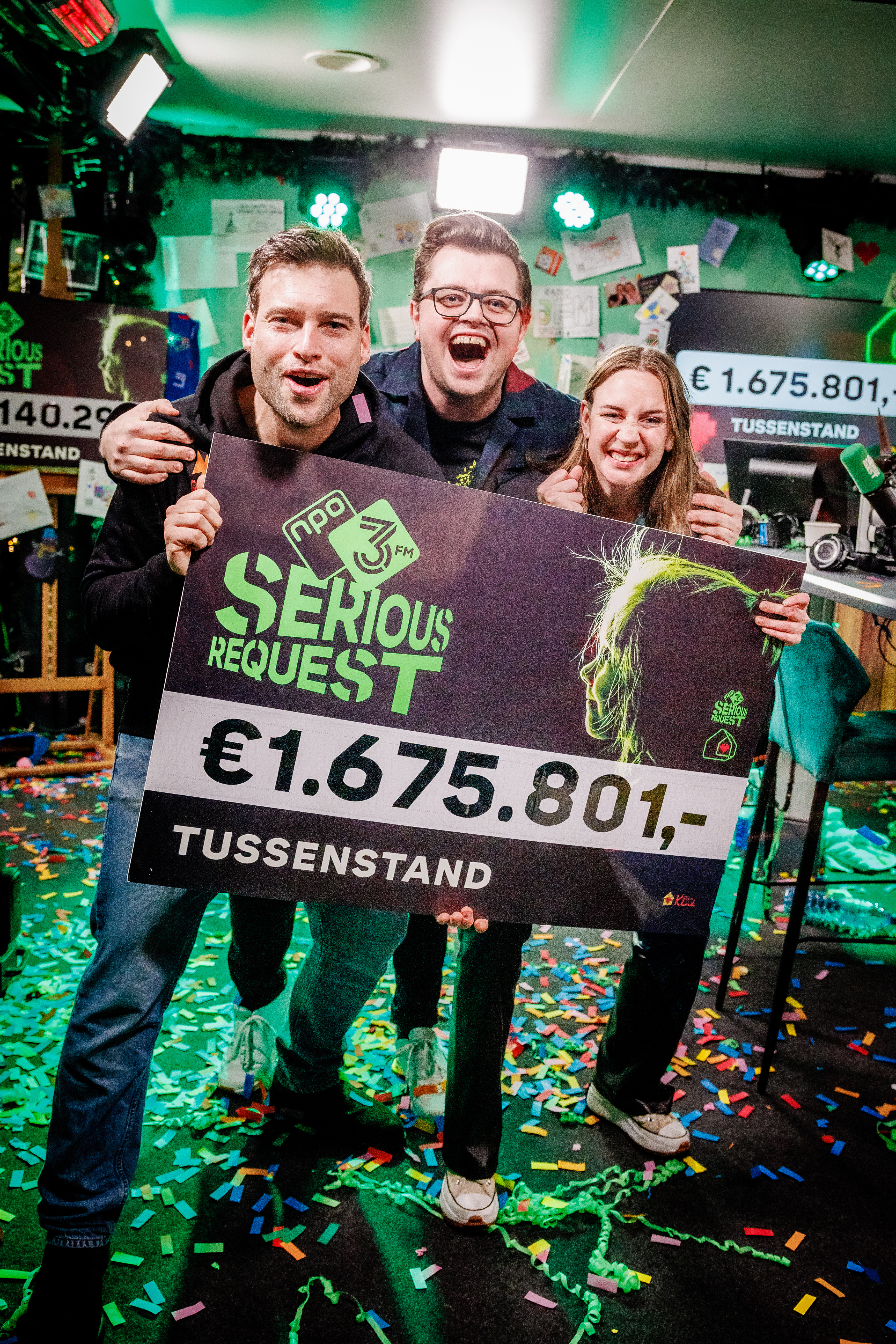 Met nog minder dan 1 dag op de teller staat de tussenstand van 3FM Serious Request op €1.675.801. Glazen Huis-dj’s Rob Janssen, Barend van Deelen en Sophie Hijlkema: “Wauw, wat een ongelofelijk mooi bedrag! Allemaal dankzij de inzet van heel Nederland. Dank jullie wel! We zetten de eindsprint in naar kerstavond: doneer, vraag die plaat aan of steun een van de talloze mooie acties.