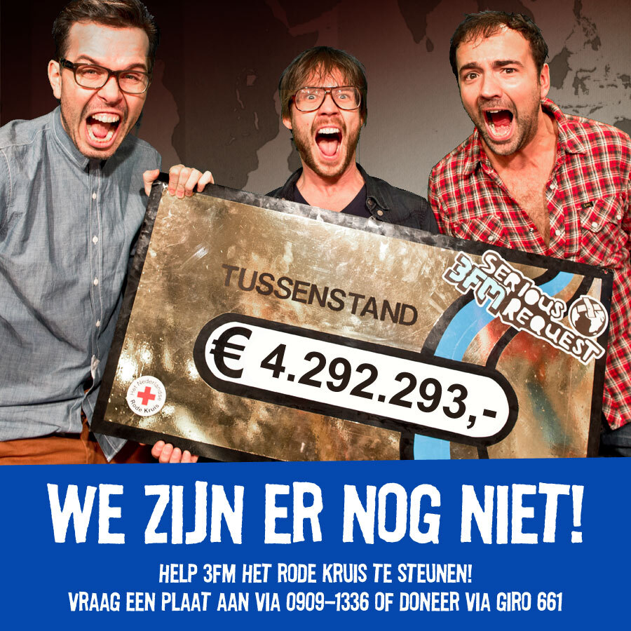 Allemachtig, wat een hoop geld! Giel, Gerard en Michiel geloofden hun ogen niet toen de cheque uit de envelop kwam. De tussenstand van vandaag kwam neer op € 4.292.293,-!
