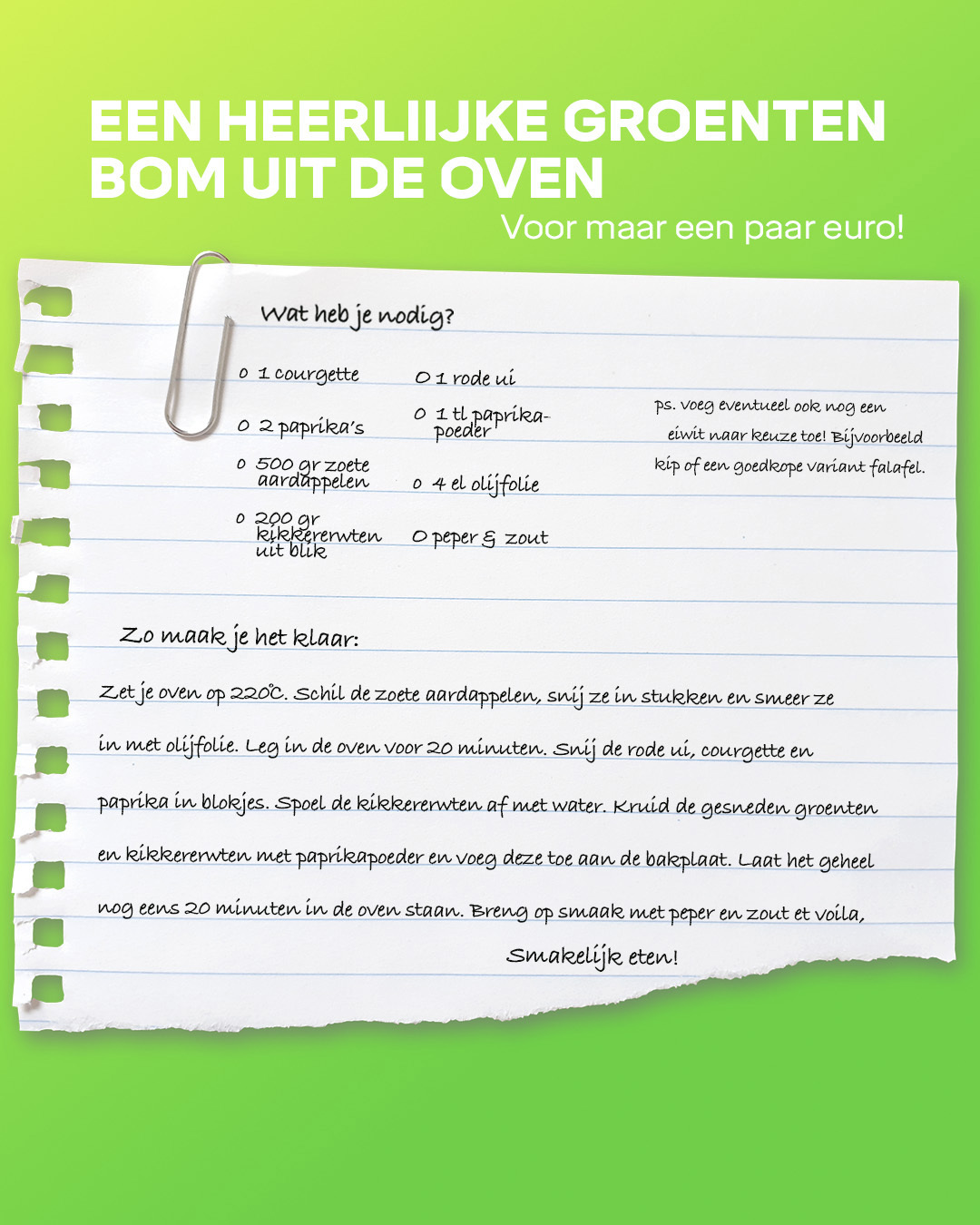 “Alle groenten die niet te verbouwen zijn op Nederlandse grond tijdens het huidige seizoen, kosten automatisch meer. Ze moeten namelijk helemaal vanuit het buitenland komen, wat overigens ook niet helemaal fijn is voor het klimaat. Zoek op welke groenten bij welk seizoen passen of kijk naar de schappen. Want ligt er opeens heel veel van een bepaalde groente, vaak ook nog gecombineerd met verschillende aanbiedingen, dan weet jij dat deze groente helemaal bij het seizoen past.”
