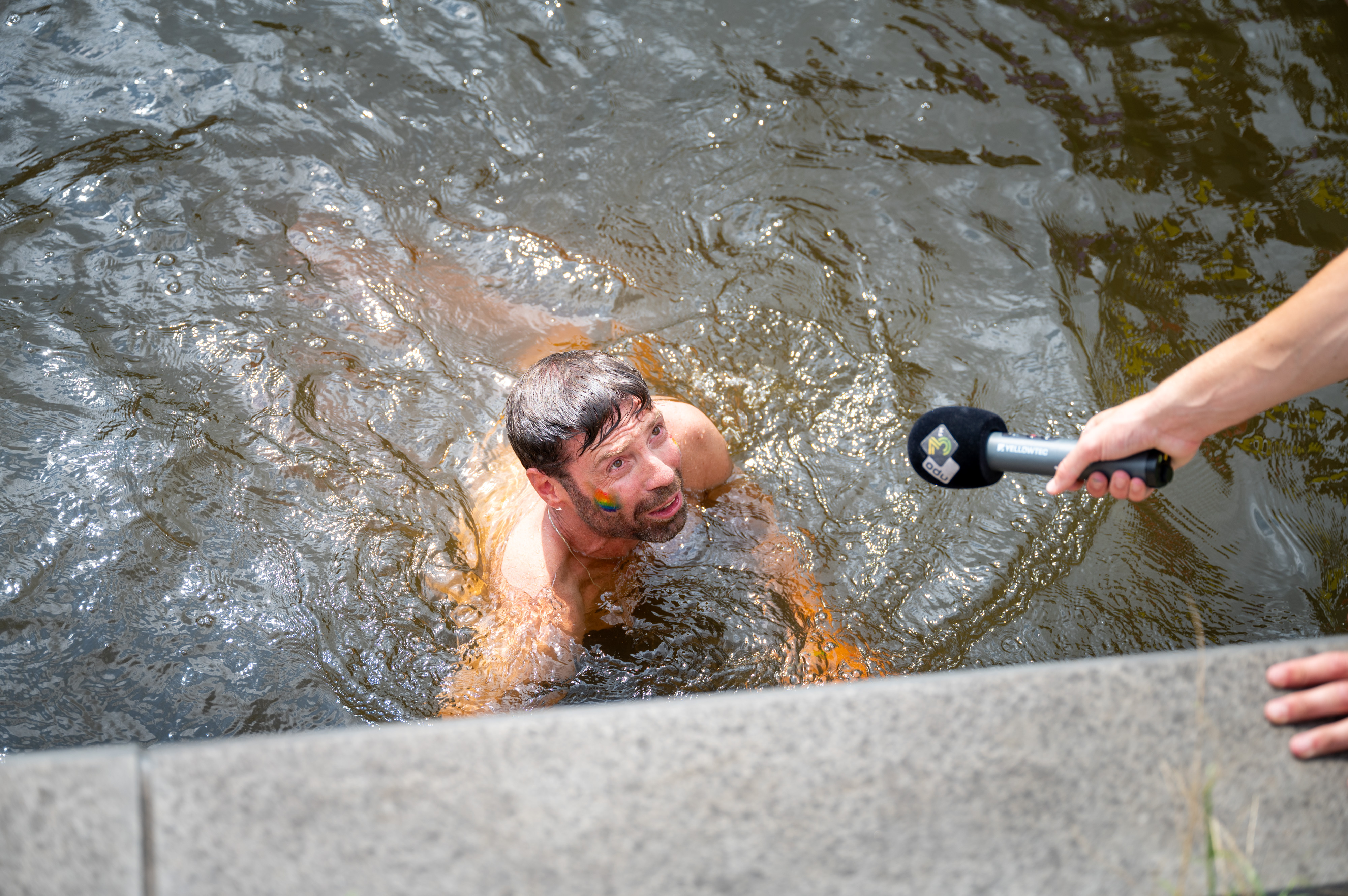 3. Moest je per se meevaren bij de Canal Pride. Tuurlijk niet! Je kunt ook zwemmen. 3FM-dj Timur deed mee.