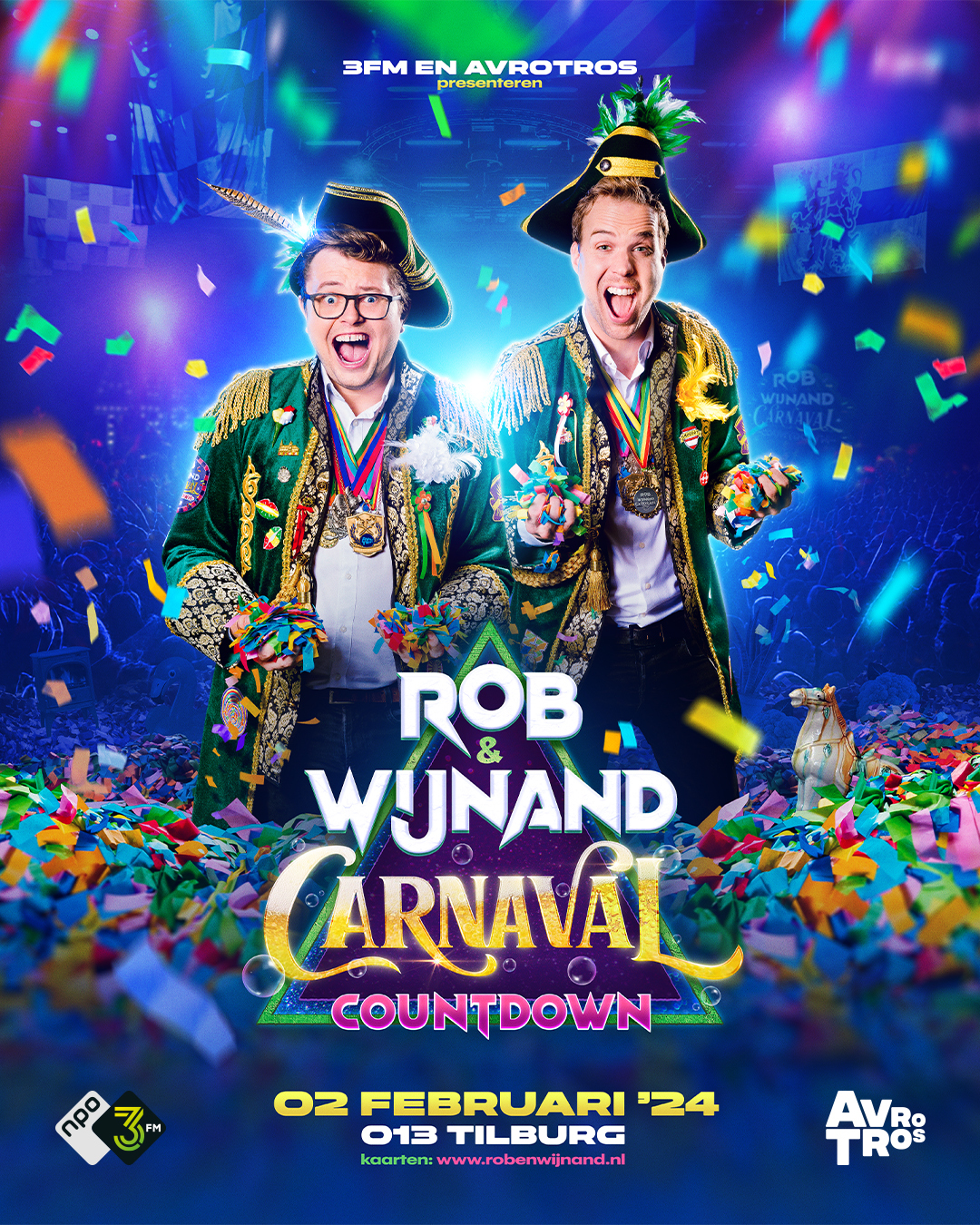 'Rob & Wijnand Carnaval Countdown' is teruggekeerd met een nieuwe editie. Op vrijdagavond 2 februari 2024 staan Rob en Wijnand met al hun carnavalsvrienden in de grote zaal van 013 Tilburg voor je klaar om een groot feest neer te zetten!