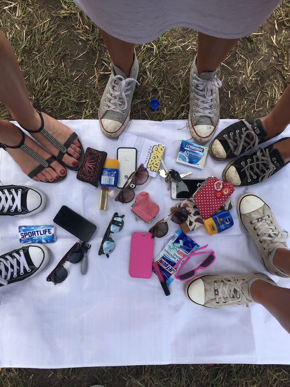 Dit is hoe de inhoud van meidentasjes eruit ziet. Anouk (2x), Aafke en Jitske (25) zijn zo te zien niets vergeten.